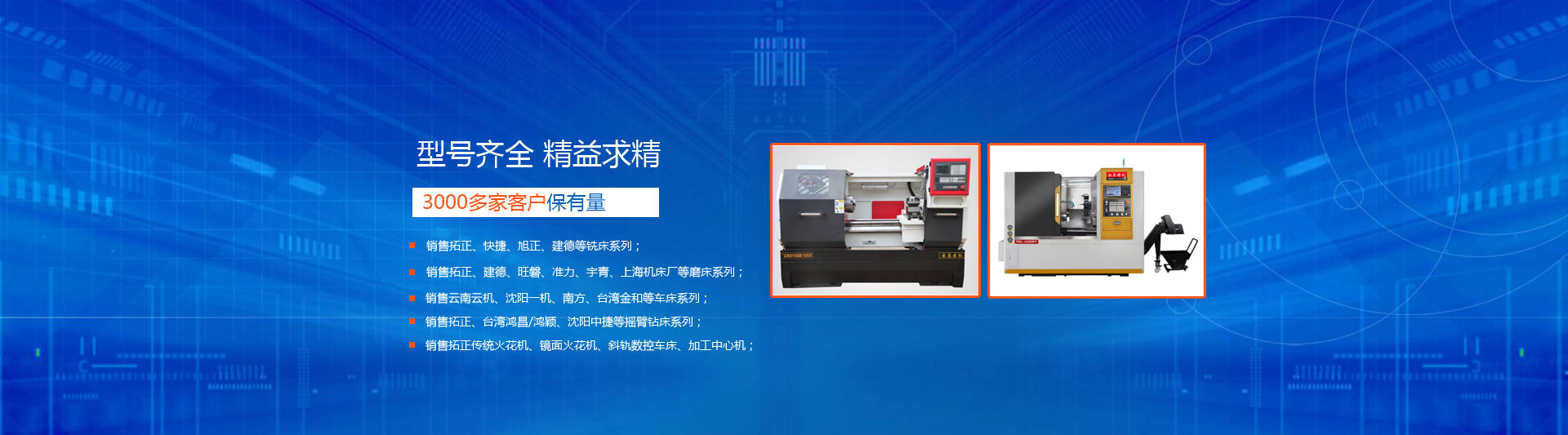 銷售拓正、快捷、旭正、建德等銑床系列;銷售拓正、建德、旺磐、準力、宇青、上海機床等磨床;銷售云南云機、沈陽一機、南方、臺灣金和等車床系列銷售拓正、臺灣鴻昌/鴻穎、沈陽中捷等搖臂鉆床系列;銷售數控雕銑機、火花機、加工中心機、中走絲線切割等。